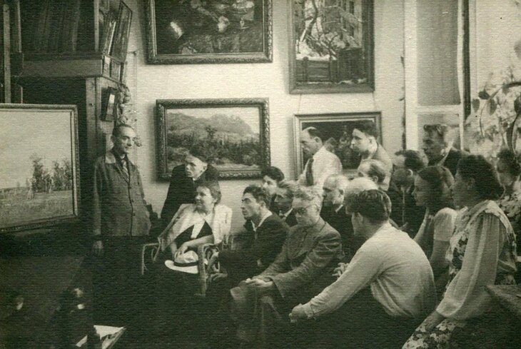 Фотография. Художник Б. Н. Яковлев на встрече с посетителями в своей мастерской на Масловке в Москве. 1958