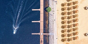 Живописный искусственный водоем ищите в глубине парка, в поймах рек Шмелевки и Кузнецовки. Берег оборудован деревянными дорожками и лавочками для отдыха. Есть и специальная зона солярия с шезлонгами и зонтиками. А еще найдете дубовую рощу, баскетбольную площадку, локации для воркаута и шахматные столы.