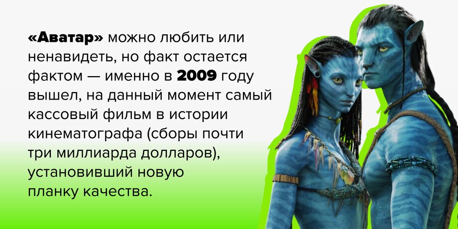 До сих пор ее не смог перепрыгнуть и сам Джеймс Кэмерон — сиквел «Путь воды», вышедший спустя 13 лет долгой работы, отлично показал себя в прокате, но все равно не смог перебить успех оригинала.