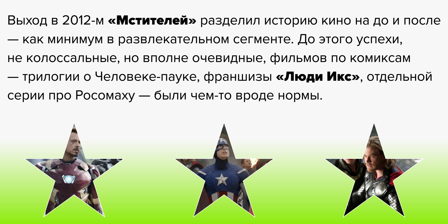 Стоит сказать, что нехилый толчок супергеройскому кино до этого дал и «Темный рыцарь» Кристофера Нолана, но именно с «Мстителей» началась повальная комиксомания — даже среди тех, кто никогда не читал книжки с картинками.