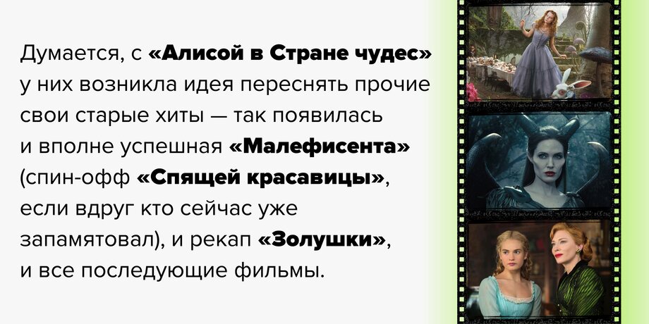Стоит заметить, что Disney, глядя на успех вышедшего в 2008 году «Железного человека», через год купил Marvel с потрохами, став главным бенефициаром супергеройского кино. А еще спустя год, в 2010-м, «мышиная студия» выпустила «Алису в Стране чудес» — live-action-версию их классического мультфильма 1951 года. И не прогадала, собрав более миллиарда долларов в прокате.