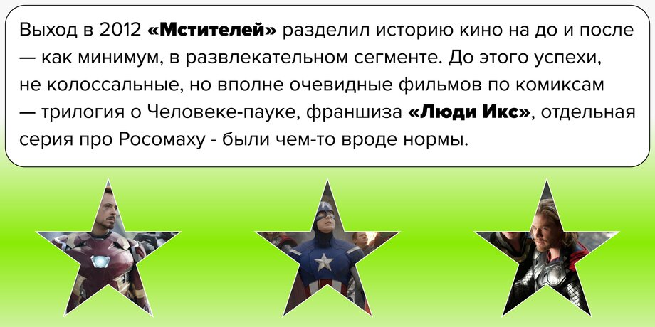 Ну да, есть «Сорвиголова», есть «Форсаж», есть «Пираты Карибского моря». Но режиссер Джон Фавро смог капитально изменить правила игры. Колоссальные по тем временам сборы в 1,5 миллиарда долларов во всем мире (в России, кстати, «Мстители» собрали 43 миллиона — тоже внушительная такая цифра!) означали, что теперь мужчины в трико и смешных доселе масках в тренде.