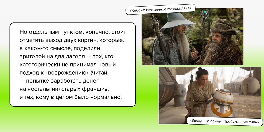Первый — «Хоббит: Нежданное путешествие» (2012), приквел классической трилогии «Властелин колец», сделанный под патронажем Питера Джексона и нового режиссера Гильермо дель Торо (плюс продолжения 2013 и 2014 годов).