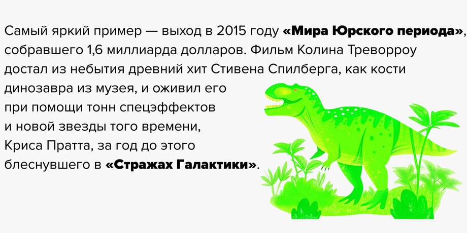 В 2006 году, вполне успешно прошел «Казино Рояль» с новым Джеймсом Бондом в исполнении Дэниэла Крэйга, но главный триумф случился с «Координатами „Скайфолл“» в 2012-м, к 50-летию бондианы. Можно также вспомнить и «Форсаж 5», в котором создатели, по сути, переизобрели концепцию гоночной серии после неудачной четвертой части, возродив эту померкшую было франшизу.