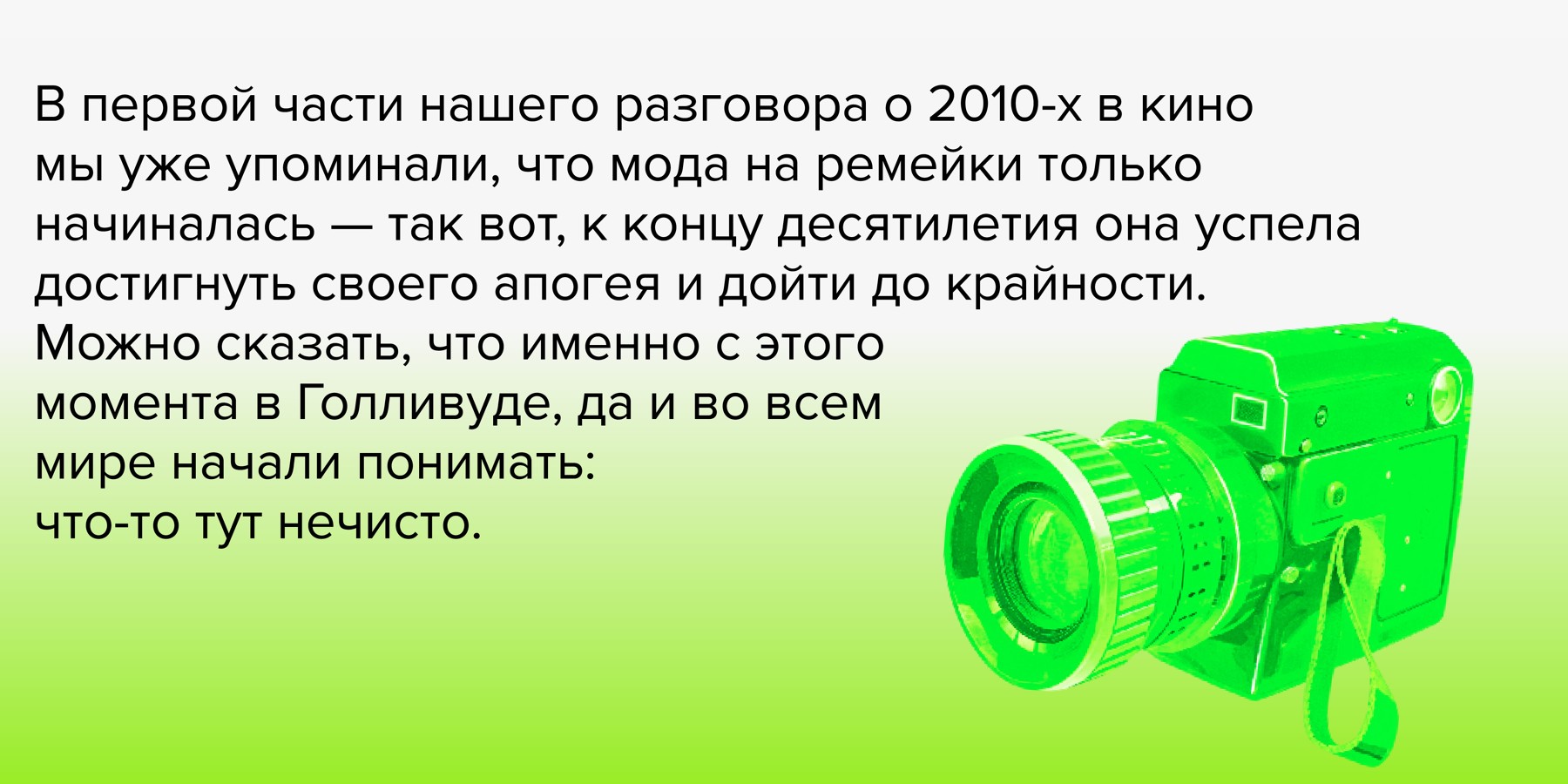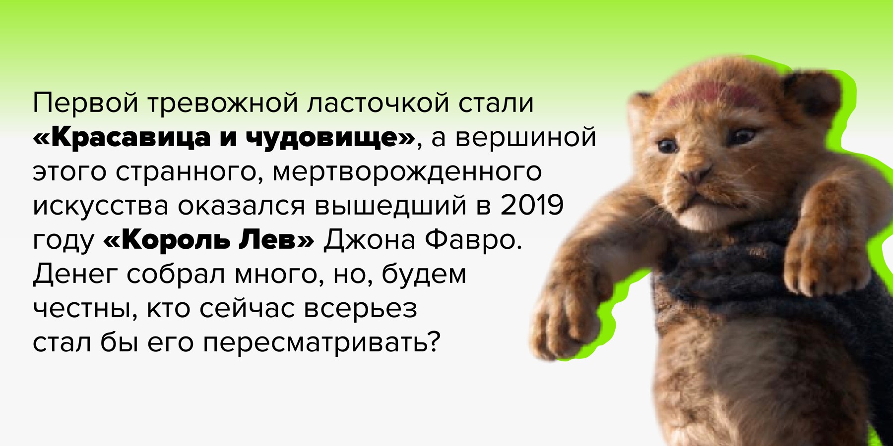 Плюс, конечно же, не стоит забывать и про еще одно явление, которое сейчас мало у кого вызывает восторг, — ремейки диснеевских мультфильмов, в которых рисованных персонажей заменяли актеры и компьютерная графика.