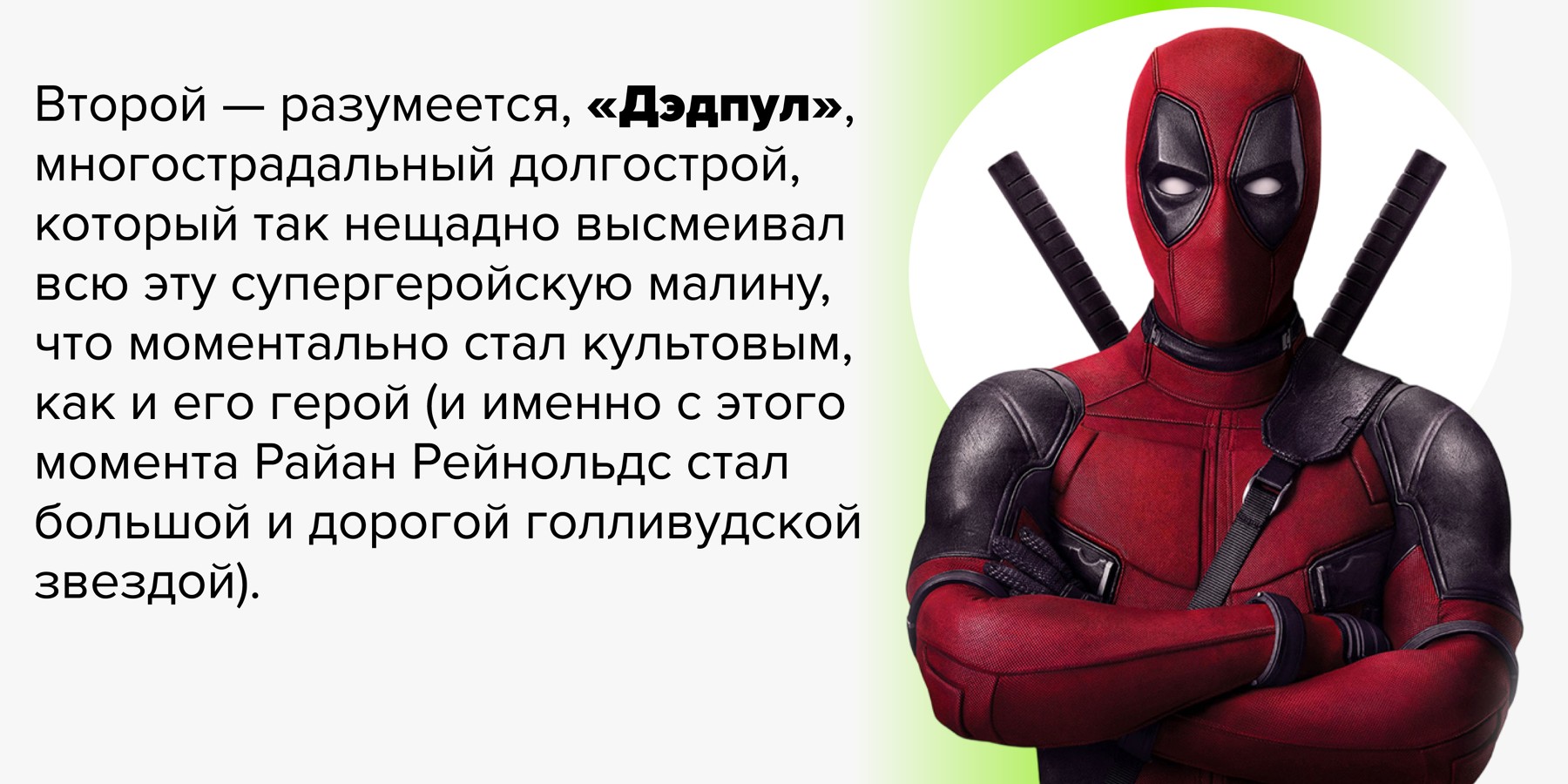 Это не единственные примеры — бывшие злодеи вмиг стали любимчиками публики: в 2018 году вышел «Веном» и вторая часть «Дэдпула», а в 2019-м — «Джокер», который до 2024-го держал планку самого кассового фильма со злодеем комиксов в главной роли, пока его не сместили… Правильно, Дэдпул с Росомахой.
