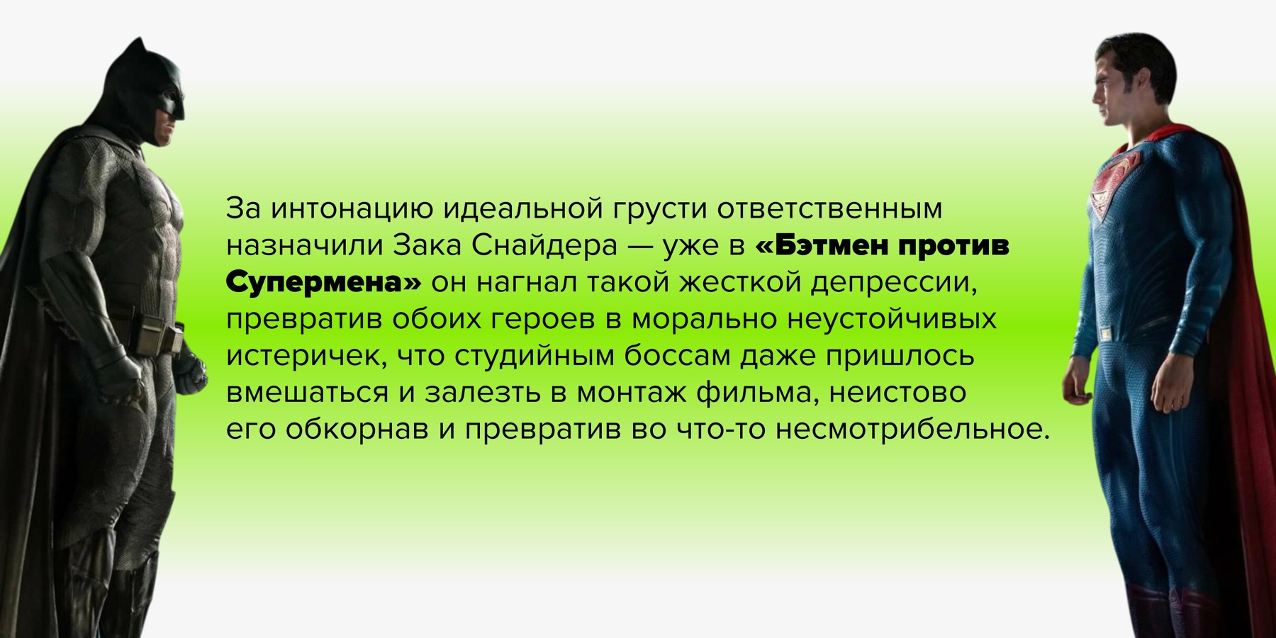 Тренд на снижение уровня пафоса в супергеройском кино в одних проектах шел параллельно с увеличением его в других — и, кажется, эти два показателя пропорциональны друг другу. В первую очередь это присуще, конечно же, комиксам во вселенной DC — впрочем, еще бы, с такими-то кассовыми сборами.