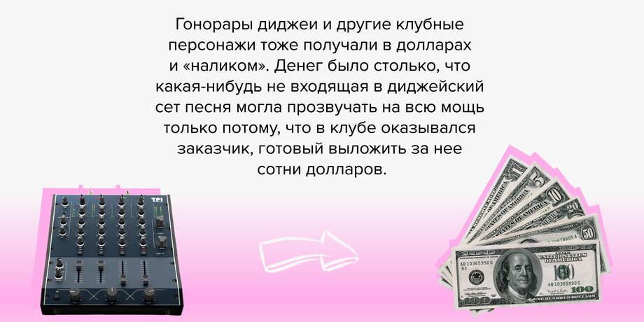 Все, кто мог, старались погрузиться в ночную полузапретную матрицу с легким доступом ко всему недоступному, включая знакомства с влиятельными людьми или селебрити. Алкоголь (бутылка шампанского могла стоить больше тысячи долларов) лился рекой.
