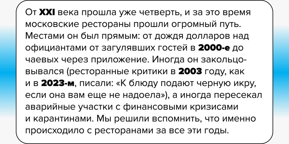 Пришедшая в себя после кризиса 1998 года публика десять лет отрывалась в клубах и ресторанах за все голодные 1990-е. Открытия ресторанов были блестящими светскими мероприятиями, на которые иногда даже выписывали зарубежных звезд — поприсутствовать или даже что-нибудь спеть и смикшировать.