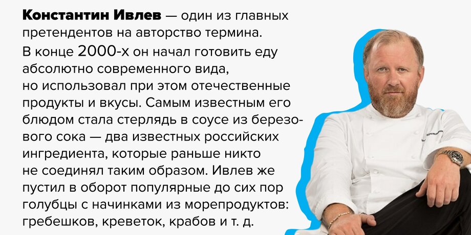 Распространение технологии су-вид позволило довести до небывалой мягкости говяжьи щеки, которые раньше использовали разве что для начинки пирожков. Теперь они стали одним из столпов московского меню. На этом фоне впервые заговорили о потенциале российских продуктов: Анатолий Комм в 2008 году открыл ресторан «Варвары» и объявил, что будет готовить почти исключительно из отечественных ингредиентов. В «Варварах» подавали дегустационные сеты, которые Комм называл «спектаклями». Они включали в себя авторские версии блюд русской и советской кухни: прозрачные пельмени, капсулы из бородинского хлеба со спиралью из нерафинированного подсолнечного масла, селедку под шубой в виде роллов в свекольной «бумаге» и т. д.