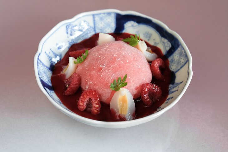Здесь моти белого цвета немного напоминает перевернутое хинкали, на которое положили клубнику. Помимо этого вкуса, есть начинка из малины. Изготавливают десерт вручную после его заказа.