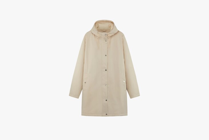 Светло-бежевый плащ на прохладную погоду с легким утеплителем и капюшоном. Он прямого кроя, так что подойдет хоть к юбке, хоть к джинсам и брюкам.