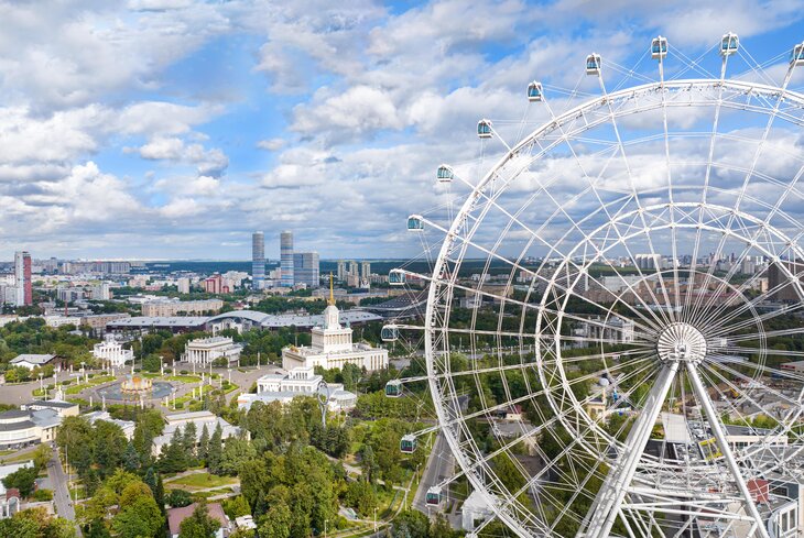 Колесо обозрения на ВДНХ — самое большое не только в Москве, но и в Европе. Его высота составляет 140 метров, обзор в хорошую погоду — 50 километров, а полный круг занимает почти 19 минут. Одновременно на колесе могут прокатиться 450 человек. У колеса 30 закрытых кабин, пять из которых — с прозрачным полом для тех, кто любит экстрим. Еще в пространстве внизу можно позаниматься йогой, а прямо на высоте зарегистрировать брак.