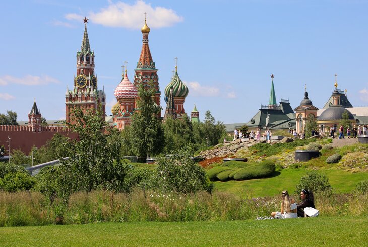 Парк Зарядье в Москве — современный и уникальный зеленый оазис в центре города, расположенный рядом с Красной площадью и Кремлем. Символом парка стал парящий над Москвой‑рекой мост — одна из самых популярных смотровых площадок города. Еще сюда приходят гулять по необычным местам, например, по Ледяной пещере — арт‑инсталляции в холодном павильоне (температура в нем меняется от -4 до -9°C) или флорариуме — многоярусной оранжереи. Растения там выращивают по специальной системе без почвы.