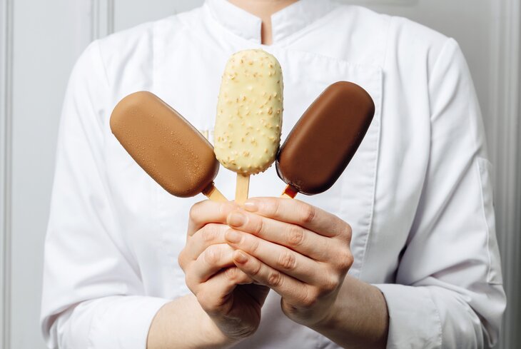 Вместо традиционной глазури это эскимо покрыли белым шоколадом с дробленой фисташкой. Не ждите при укусе, что получите пломбир: вместо него — нежное пралине.