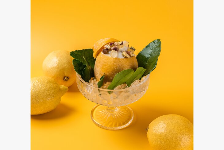 Фисташки для десерта не стали мелко дробить, а положили прямо целые орехи на верхушку цитрусового парфе. Внутрь добавляют много цукатов, а подают все это в лимоне.
