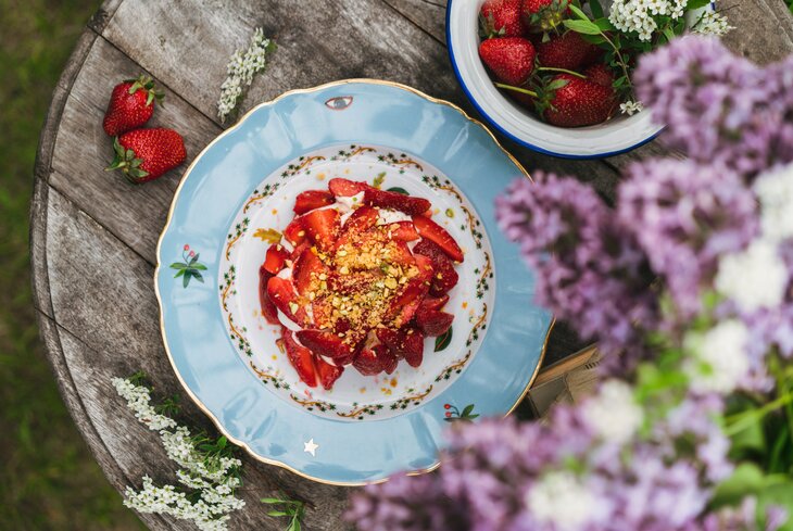 Гора клубники и россыпь рубленой фисташки — первое, что замечаешь при виде этого десерта. Под ней спрятались крошка из бретонского печенья и нежный сливочный крем, напоминающий пломбир.