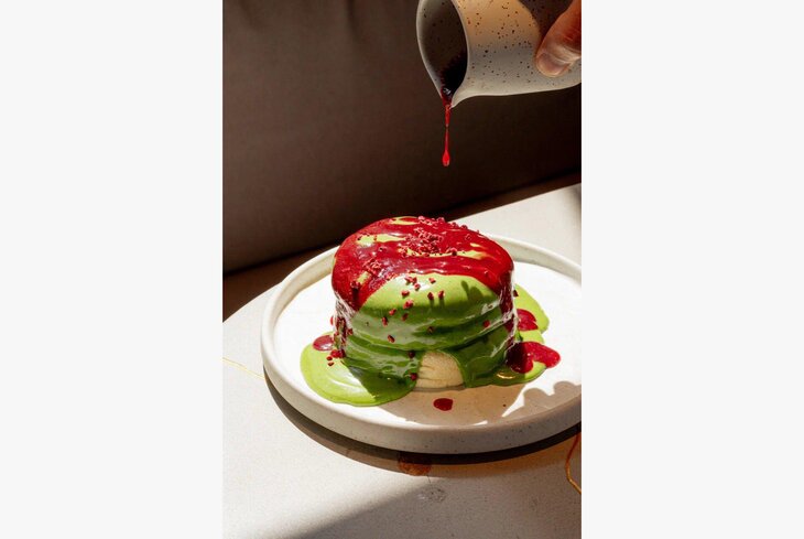Стопку пухлых панкейков облили фисташковым пралине так, что их даже не видно. К нему в дополнение — кислый малиновый соус и сублимированные ягоды.