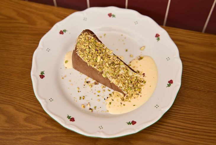 Супершоколадный чизкейк подают с ванильным соусом и щедрым слоем фисташек — они буквально сыплются с торта! Внутри — очень нежный, а снаружи — с тонкой темной корочкой.