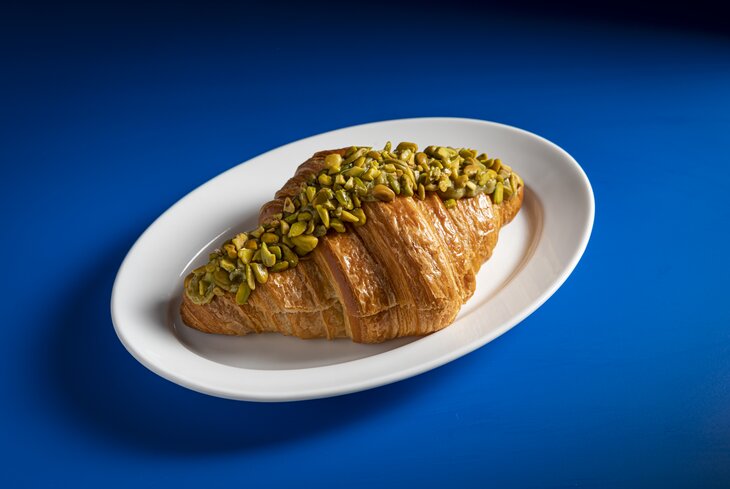 Топовым сочетанием фисташки и малины наполнили пышные круассаны. На вкус в меру сладко, нежно и с яркой кислинкой.