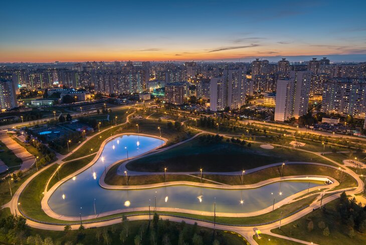 Прогулки по Москве 2025 советуем сочетать с отдыхом среди деревьев. Их найдете много в небольшом живописном парке на юго-западе города. Его построили к 70-летию Победы в Великой Отечественной войне. На территории найдете тренажеры для детей и взрослых, велодорожки и хоккейную коробку, которую летом превращают в баскетбольную площадку. В центре парка находится сухой фонтан с подсветкой и множество лавочек для отдыха на природе.
