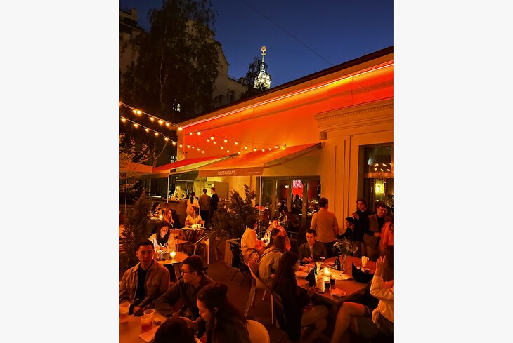 Спрятанная в тихом дворике локация днем встречает гостей как ресторан, а ближе к ночи тут убирают столики и устраивают танцы с диджеем. На старте подают паштет из куриной печени с яблочным джемом (490 рублей), в основных блюдах — говяжьи щечки с мятым картофелем (1 150 рублей), а на десерт — ромовая баба с ганашом из белого шоколада (705 рублей).