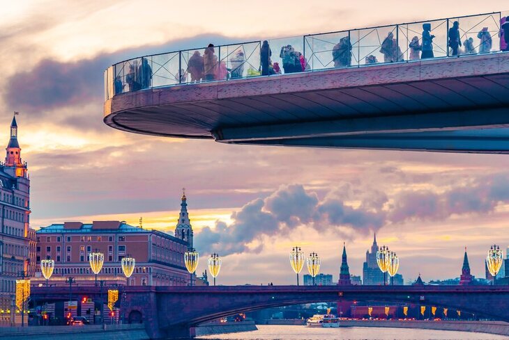 Парк «Зарядье» в Москве — современный и уникальный зеленый оазис в центре города, расположенный рядом с Красной площадью и Кремлем. Символом парка стал парящий над Москвой‑рекой мост — одна из самых популярных смотровых площадок города. С него можно разглядеть центр города: высотку на Котельнической набережной, Кремль и собор Василия Блаженного.