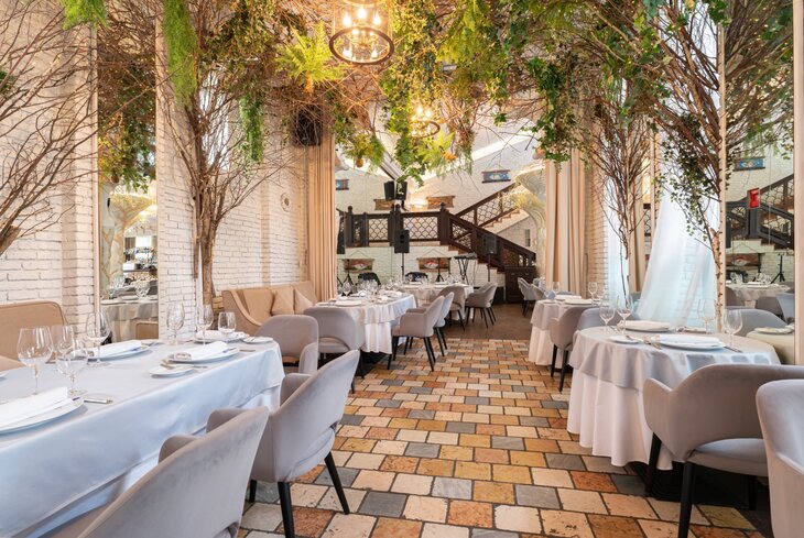 Старожил района, открытый еще в 1997 году. Тут тоже уж очень роскошно: в одном зале — венецианские люстры, в другом — рояль и круглогодичная зеленая терраса.