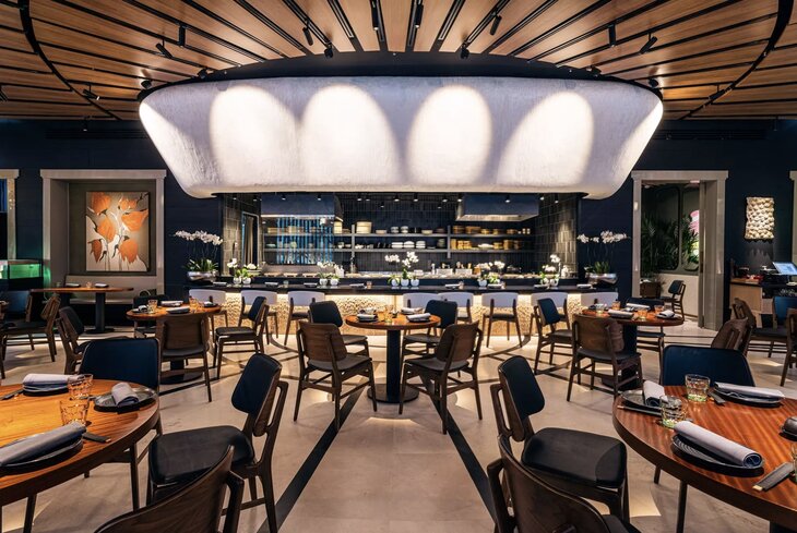 Эффектное паназиатское местечко с просторным залом, бамбуком по периметру и цветами сакуры под потолком. Но смотреть будете не только по сторонам, но и в направлении кухни: она тут открытая. Так что от начала до конца сможете проследить, как выкладывают битые огурцы (1 290 рублей), делают креветки васаби (1 790 рублей) и крутят роллы с гребешком и халапеньо (2 690 рублей) и с угрем и баклажаном (1 690 рублей).