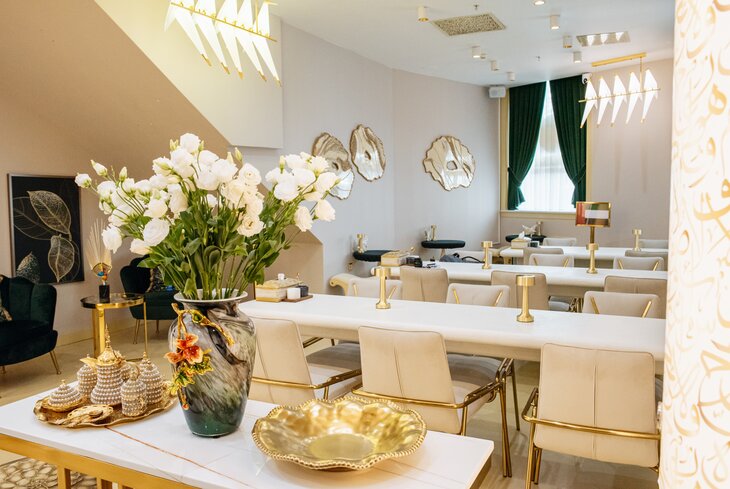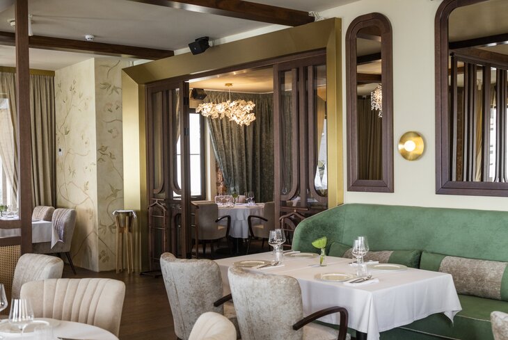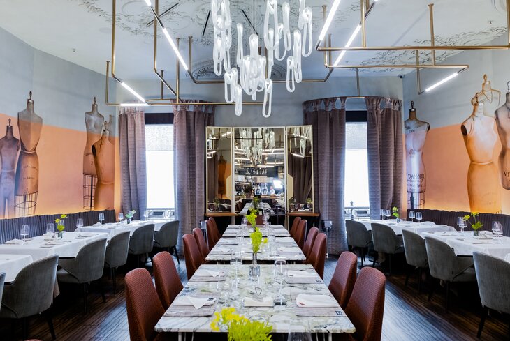 Изысканное место, которое сперва напоминает швейное ателье, а не ресторан. Интерьер и атмосфера подчеркивают идею мастерской: приборы с игольными ушками, светильники в виде манжет, миниатюрные утюги, а в витринах — экспонаты Музея моды Италии и дизайнерские коллаборации.