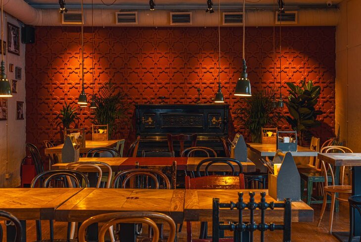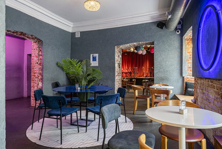 Бар занимает три этажа особняка в Гнездниковском: на первом найдете барную стойку, на втором — сцену с диджейским пультом, а на третьем — множество посадочных мест для отдыха. Тусовки проходят лишь вечером, а в остальное время — кинопоказы, настольные игры и даже быстрые свидания. В меню — только стритфуд и завтраки вроде скрембла с лососем и чеддером (450 рублей) и бриоши с индейкой (650 рублей).