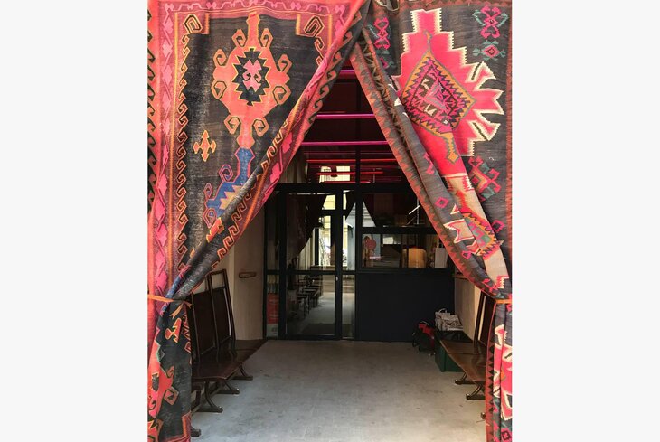 Турецкое бистро с красным неоном и минималистичным интерьером в узком пространстве на три столика. Ориентир, чтобы не заблудиться, — расшитый ковер вместо двери. Заходите внутрь и пробуйте кебаб с рыбой (450 рублей) или курицей (430 рублей) и кюфту с бараниной и говядиной (450 рублей). Фишка: во все блюда добавляют много зелени и зерна граната.