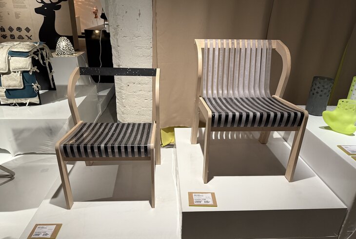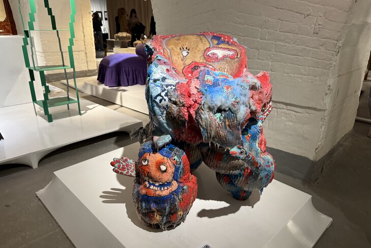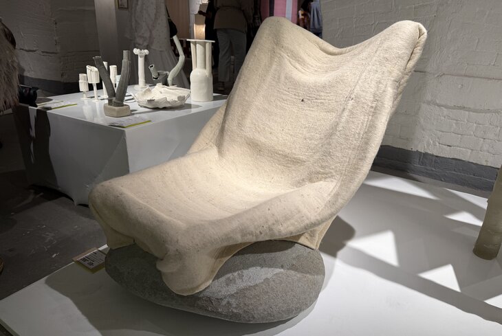 Важно понимать вот что: большая часть экспонатов здесь работает как искусство, и они не особенно функциональны в интерьере, потому что очень хрупкие. Большая, но не всё. Например, есть кресло-качалка за 300 тысяч рублей, в основе которого — 250-килограммовый камень, который художник нашел в реке в Алма-Ате. Он еще нам фото этого места показал — красиво. Сверху — войлок, это опять же к тренду на натуральность.