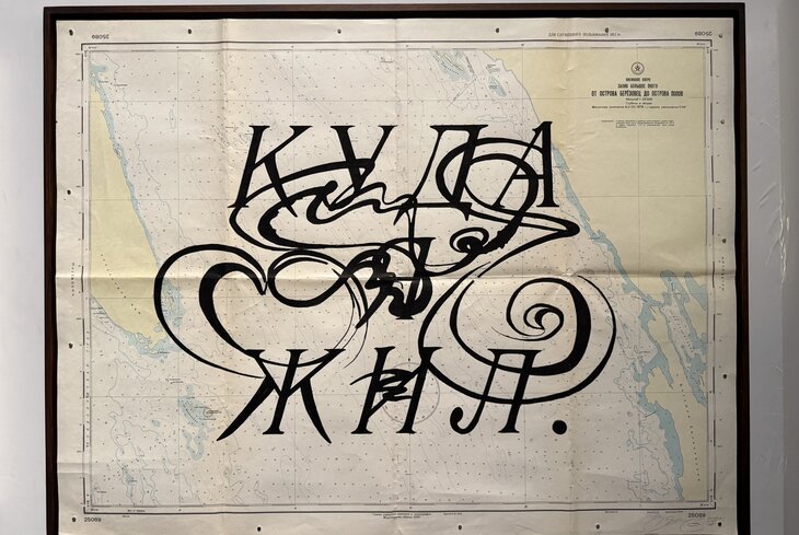 В-третьих, не пройдите мимо серии с надписями на картах. Тут нет какого-то глубокого смысла — что на схеме, с тем и будет связана строчка поверх нее. Почему она в топе? Согласитесь, это универсально красиво — потому что само по себе простое и легко расшифровывается (получаем быстрое удовлетворение от понимания). А еще потому, что, пока мы ходили по экспозиции, купили и унесли сразу несколько этих работ — возвращаешься сфотографировать понравившийся арт, а его уже нет.