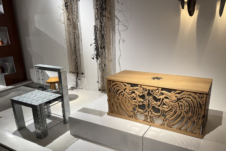 А теперь о предметах, которые невозможно использовать в быту: вот это металлическое кресло, например. Оно на курьих ножках — помните, говорили с вами про архаику? Народные мотивы в брутальном материале завораживают. Да, красиво, конечно, но в прихожей такое не поставишь (разве что со знаком «не садиться»).