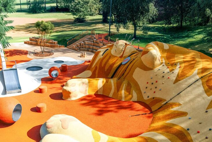 В Парке Горького на новой площадке у Голицынского пруда теперь обитает четырехметровый рыжий кот. Дети могут лазить по его хвосту, канатам, сеткам и специальным зацепам, а также держаться за усы. Эта площадка не только развлекает, но и учит бережному отношению к животным, природе и городу. Особая фишка — переговорная труба внутри кота, которая откликается мяуканьем на детские звуки.