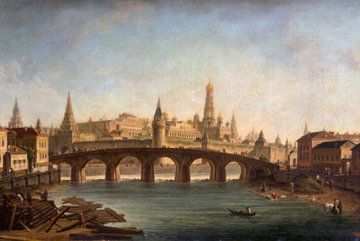 Выставка открывается разделом «Старая Москва», в котором присутствует сразу несколько работ Федора Алексеева. Сын сторожа Императорской Академии художеств, после окончания пейзажного класса Алексеев отправился оттачивать мастерство в Венецию. Сразу после этого Академия командировала его в Москву для «снятия видов». Главным героем этого полотна становится Каменный мост с его узнаваемыми арочными пролетами. Картина написана не позднее 1810 года. В экспозиции она соседствует с работой Максима Федорова, младшего современника Алексеева. Это почти тот же вид, но созданный в 1818 году, когда Кремль восстанавливали после нашествия Наполеона.
