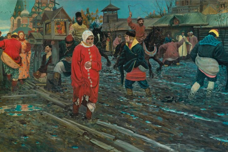 Исторический жанр в русской живописи достиг пика своей популярности в XIX веке. Сюжеты из эпохи Ивана Грозного или Смутного времени можно найти у Сурикова, Репина, Верещагина и многих других именитых мастеров. На фоне этих детально проработанных многофигурных композиций своей яркостью и простотой выделяется масштабное полотно Алексея Рябушкина. На его картине залитая ливнем улица превращается в настоящий живой поток, задающий особый ход повседневной жизни горожан.