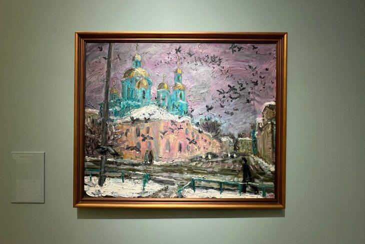 Картина Ирины Мерц — одно из самых ярких и экспрессивных полотен раздела. На нем изображен Елоховский собор, неподалеку от которого расположена мастерская художницы.
