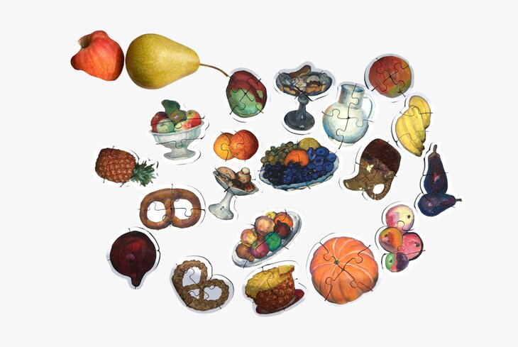 Натюрморты Ильи Машкова с яркими красками и четкими формами оказались идеальным сюжетом для детских пазлов. Их сделали в форме тыкв, яблок и тарелок с виноградом. Ищите головоломку в Третьяковке на выставке «Илья Машков. Авангард. Китч. Классика», где увидите всю ретроспективу творчества художника, привезенную из 26 галерей.