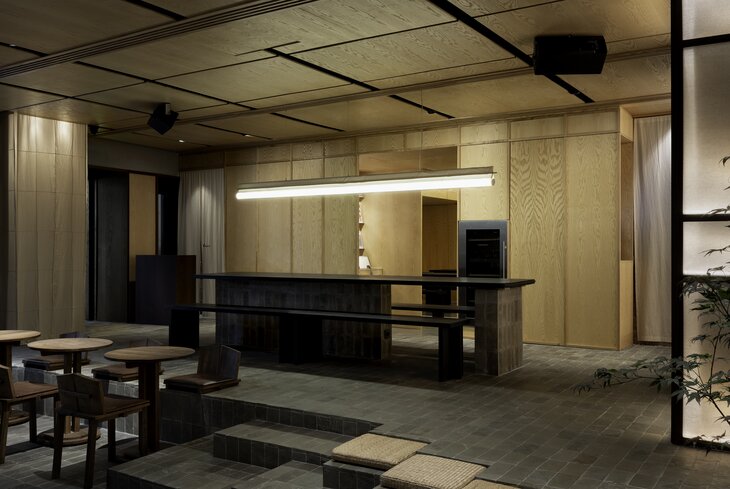 Это ресторан с раменом, аналоговой системой high-end и фокусом на японском джазе. Но тут есть чайная комната с разными видами китайского напитка от ходзитя до пуэра. В ней приглушенный свет, а расположиться можно за барной стойкой и за двумя длинными столами. Все по фиксированной цене — 570 рублей.