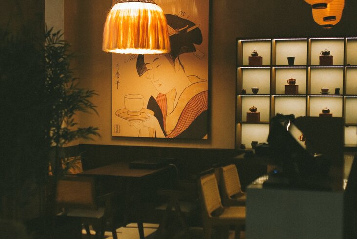 В нежно-розовом японском ресторане Ильи Тютенкова есть и черная-черная комната — «Тайная чайная» на цокольном этаже, где на полу ковер из Франции с сюрреалистическими изображениями животных и растений, а столики друг от друга отделяет полупрозрачный тюль. В меню — 50 сортов чая: например, из них восемь видов улуна и шесть шу-пуэра.