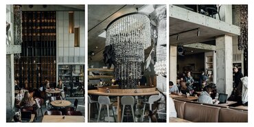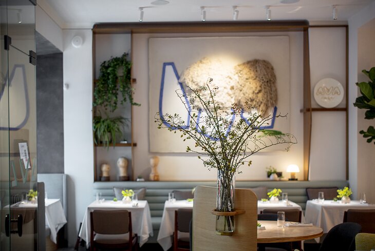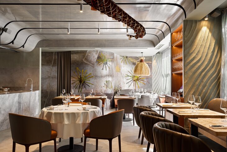 Ставку в ресторане сделали на природные формы. В лаконичном интерьере мало деталей, но много света, грубых каменных светильников, а еще картин. В меню же на первом плане — сезонные овощи. На открытой кухне готовят табуле (840 рублей), запекают болгарский перец со страчателлой (920 рублей) и тарт с томатами с джемом из фенхеля (1 240 рублей).