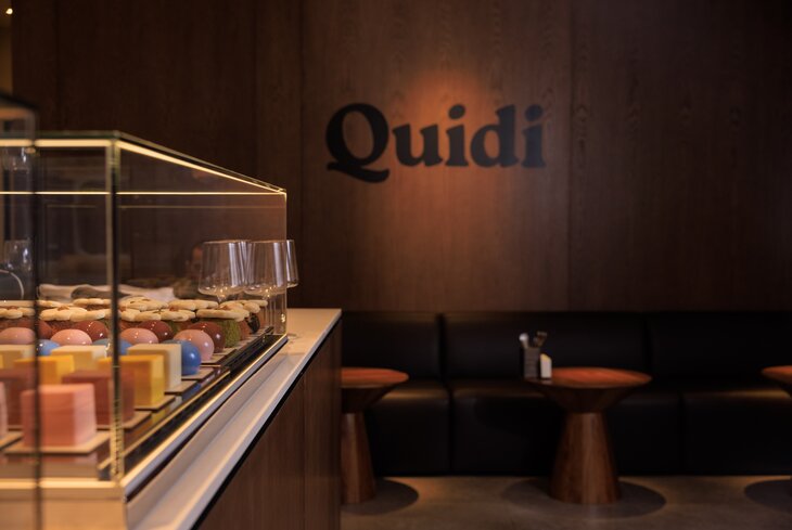 Ресторан авторства Антона Пинского и тикток-блогера Дины Саевой. Место оформили с шиком: приглушенный свет, фактурное темное дерево и геометричные формы. В центре внимания — витрина с причудливыми десертами: здесь и кубический «Сникерс» из бельгийского шоколада (290 рублей), и шарообразный нежный мусс «Бабл-гам» (290 рублей), и шу с черным кунжутом, украшенная шапочкой-цветочком (390 рублей).