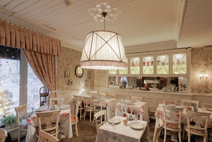 Переступаешь порог и словно попадаешь в квартиру к бабушке: на стене висят часы с кукушкой, на потолке — плафон с балдахином, а столы покрыты плотными хлопковыми скатертями в цветочек. Еда самая что ни на есть домашняя. В меню и бутерброд на деревенском хлебе с ростбифом (770 рублей), и борщ с пампушками (670 рублей), и пирожки (120 рублей) с разными начинками — мясом, капустой и яблоком.