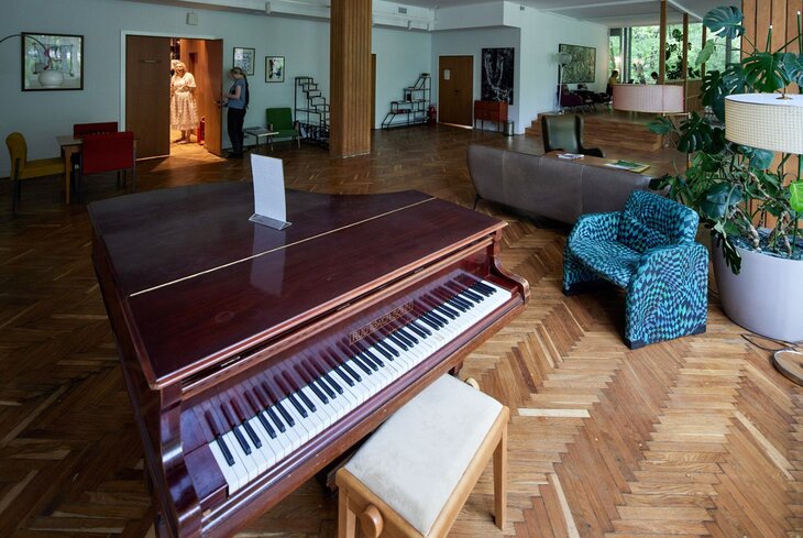 Самое фотогеничное место — стеклянный корпус-клуб постройки шестидесятых годов, где литераторы общались и отдыхали. Когда наступит золотая осень, поднимитесь на второй этаж в гостиную с бильярдом, роялем, винтажными креслами и номерами журнала «Юность» на столиках — здесь особенно красиво, когда листья за окном окрашены в теплые оттенки. А оттуда через террасу дойдите до белой винтовой лестницы — без фотографий на ее фоне обычно не уходят, особенно в золотую осень.