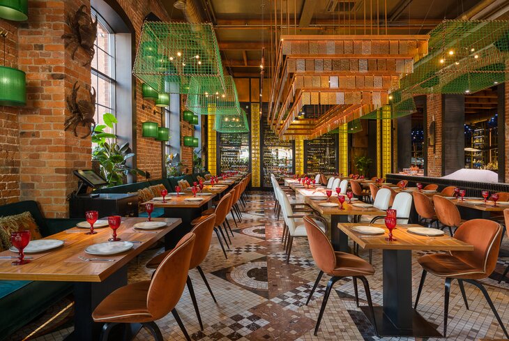 В интерьере сохранили оригинальную кирпичную кладку 1870-х, добавили эффектные синие люстры и подвесили огромные краболовки под потолком. В разделе «Крабы» — десять позиций, в том числе фаланги с топленым маслом (2 830 рублей) и целое ракообразное в перечном соусе (три тысячи рублей). А в списке «Кутабы» найдете сразу семь начинок: с печеным картофелем и трюфелем (330 рублей), с лососем и красной икрой (430 рублей) и с молодым ягненком (430 рублей).