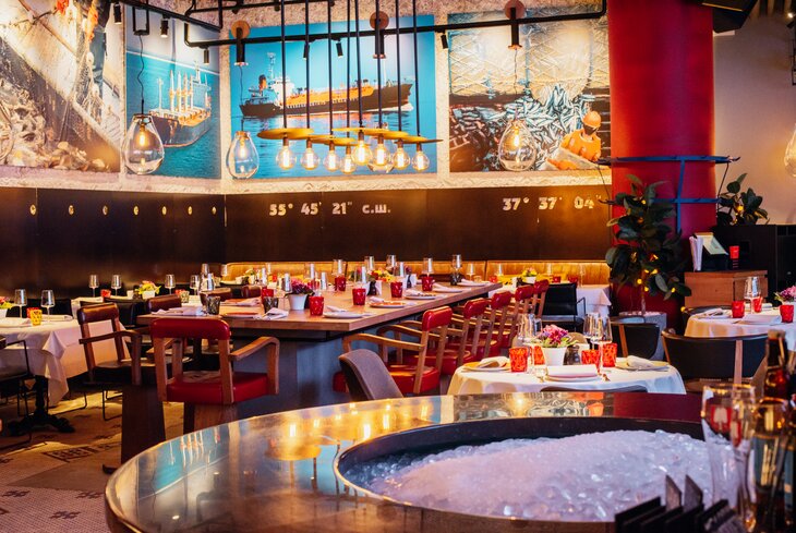 В меню ресторана — морепродукты, которые везут из рыболовецких регионов России: из Магадана, Мурманска и с Дальнего Востока. Если пришли большой компанией, берите закуски сразу на всех: сельдь из Охотского моря на тостах (690 рублей) и холодец с крабом (850 рублей). А если заглянули на спокойный ужин вдвоем, заказывайте винегрет с пряной килькой (590 рублей), кутаб с креветками (390 рублей) и роллы с угрем (790 рублей).