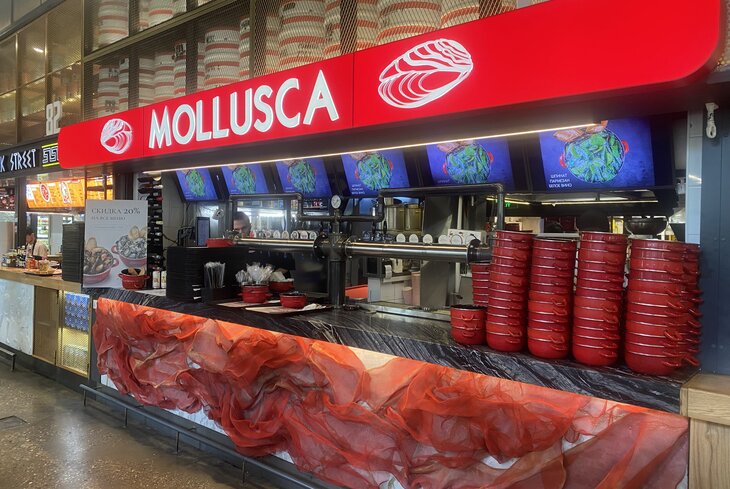 В еде тут миксуют азиатскую и итальянскую кухню. Но главный фокус — на мидиях. Для них придумали 41 (!) соус. Помимо классических сливочных, есть и необычные. Попробуйте моллюсков с манго и бри (2 100 рублей), со сгущенкой и васаби (1 900 рублей) и соленой карамелью и попкорном (2 100 рублей).
