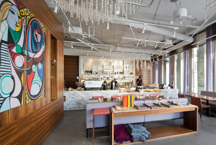 Чуть ли не самая старая «Кофемания» работает круглые сутки. В меню захотели угодить всем и при этом не углубляться в направления и концепции. Поэтому собрали и азиатские позиции, и домашние супы, и пасту, и массивные сэндвичи. Если забежали сюда утром, берите кофе. Помимо классики вроде капучино (530 рублей) и латте (750 рублей), есть авторские мандариновый раф (790 рублей) и какао с бельгийским шоколадом (790 рублей).